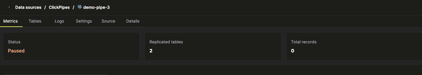 - На вкладке Источники данных нажмите на MySQL ClickPipe, который вы хотите возобновить. Статус зеркала изначально должен быть Приостановлен.