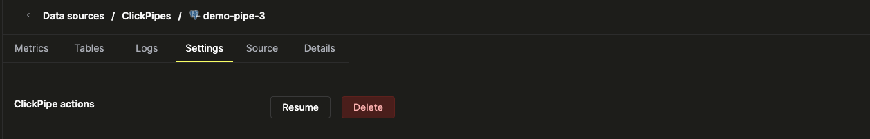 - На вкладке Источники данных нажмите на MySQL ClickPipe, который вы хотите приостановить.