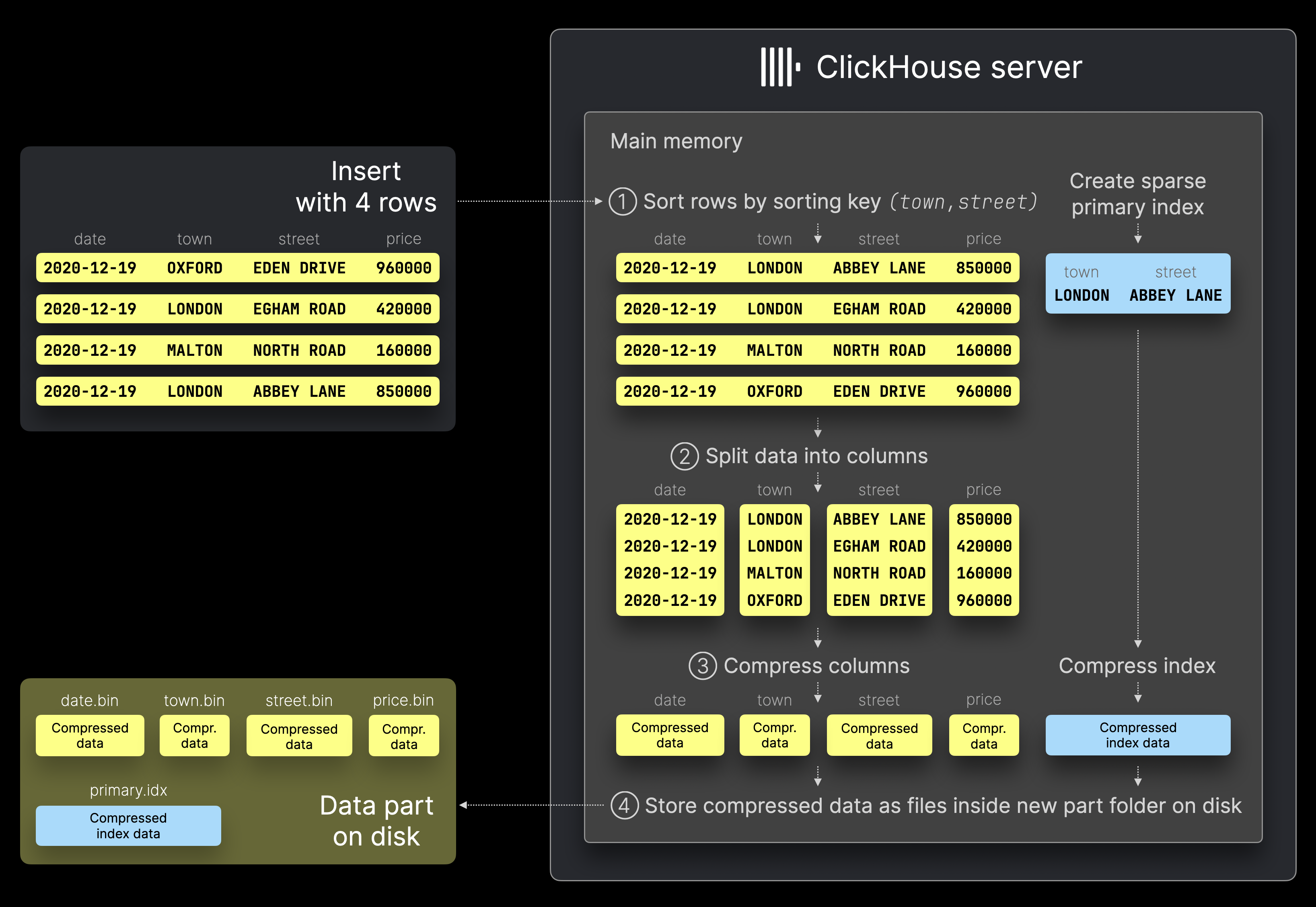 ④ Запись на диск: Сжатые колонки сохраняются в виде бинарных файлов колонок в новой директории, представляющей часть данных вставки. Разреженный первичный индекс также сжимается и сохраняется в той же директории.